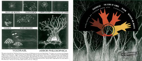 There’s been some speculation on the contents of the album, expecting a bit more than the eight tracks that have been made available digitally last month. But this edition of The King Of Limbs has those same eight tracks. The cd is housed in a 4-page wallet, with the actual cd in a slit on the right side. On the left page you can see 8 illustrations accompanied by the following titles; Roots Of Roots, Ragnorok, Urpflanze, The King Of Limbs, Codex, Axis Mundi, Yggdrasil and Arbor Philosophica. The albums credits are below. The back has the word RADIOHEAD mirrored and the track list. Catalogue number is TICK001CD.
